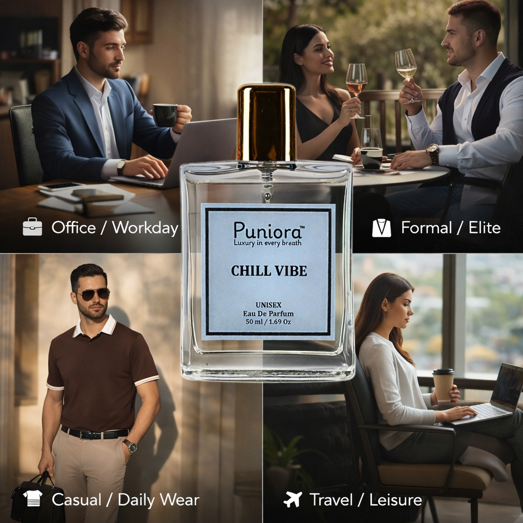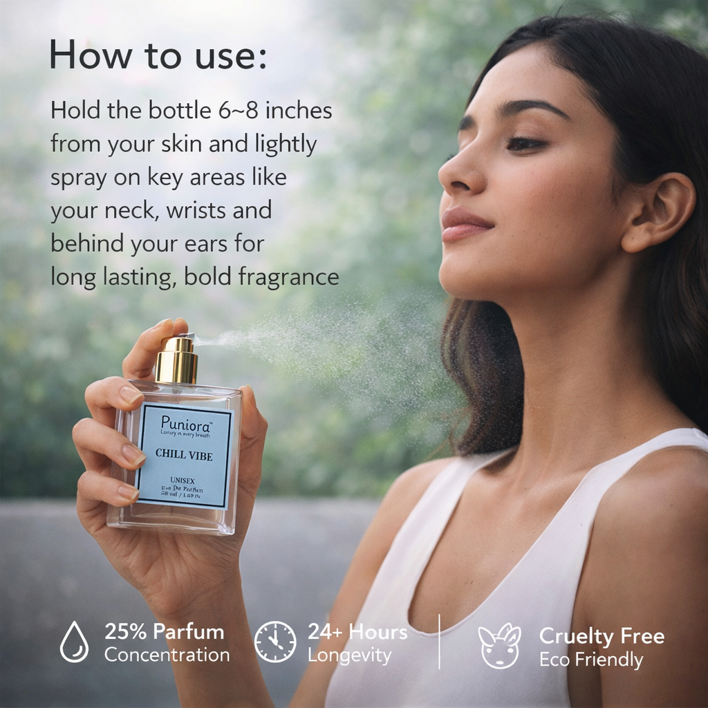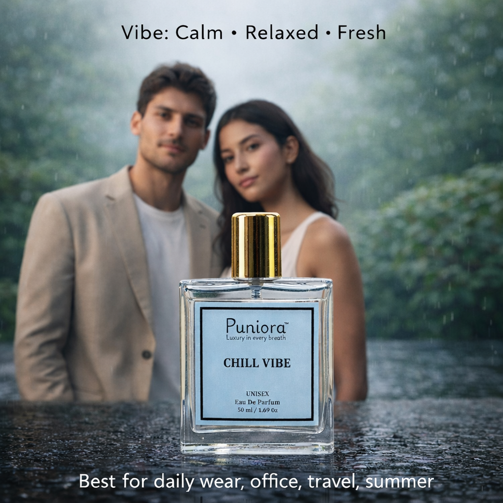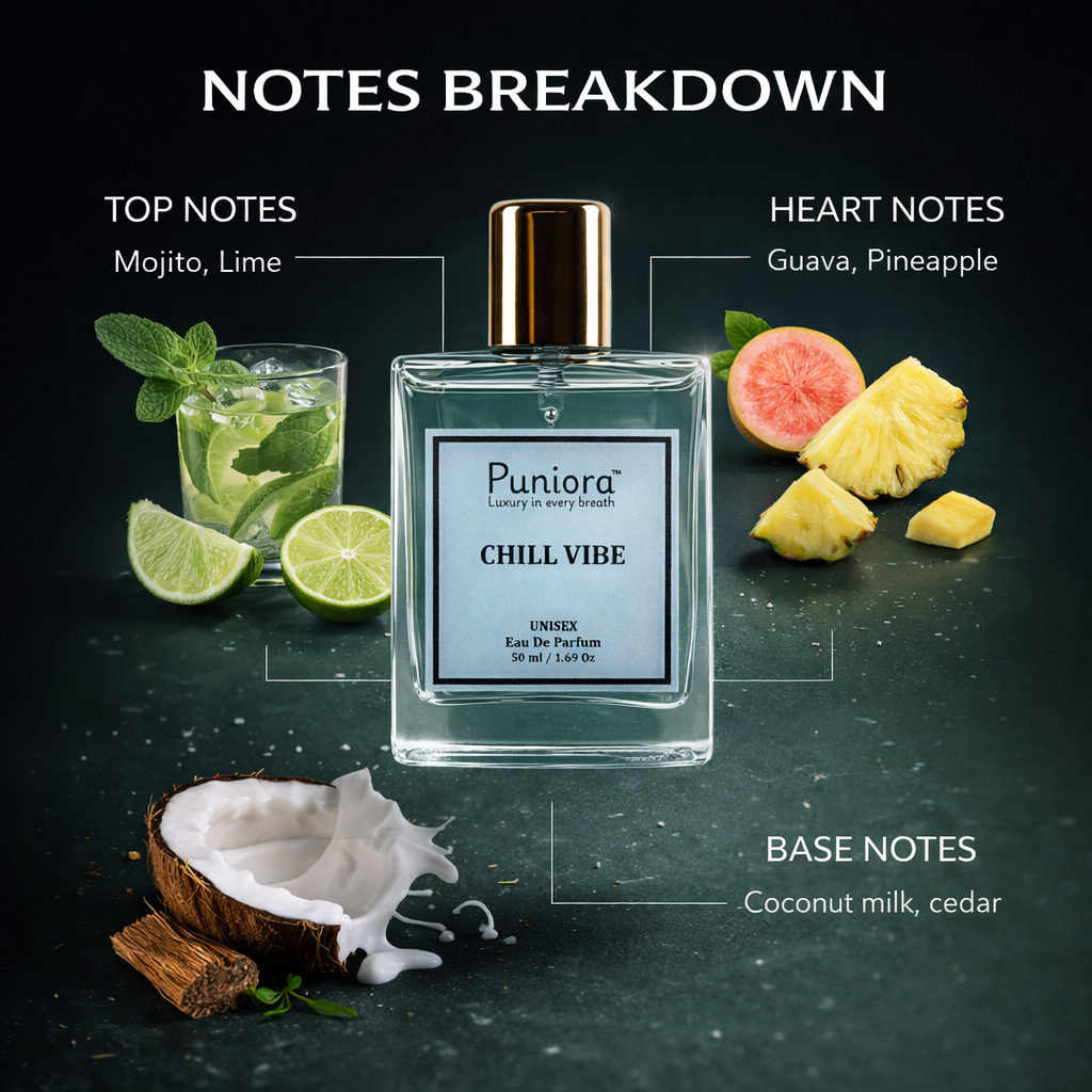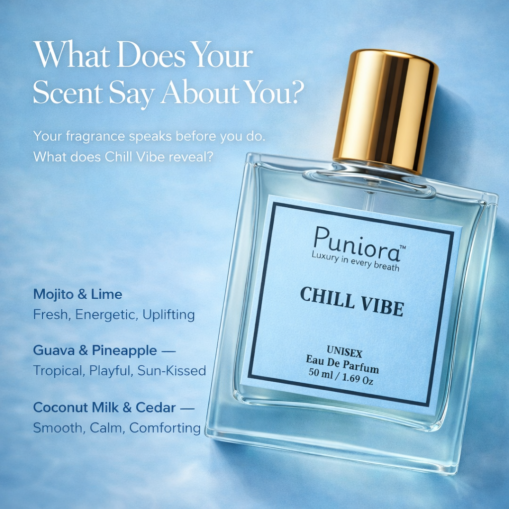 Escape into a world of calm and freshness with Puniora CHILL VIBE, a clean and tropical summer fragrance designed for both men and women. This premium best unisex perfume blends zesty lime and mojito with the sweetness of guava and pineapple, grounded in smooth coconut milk and cedar — creating the most refreshing summer fragrance for everyday wear.
