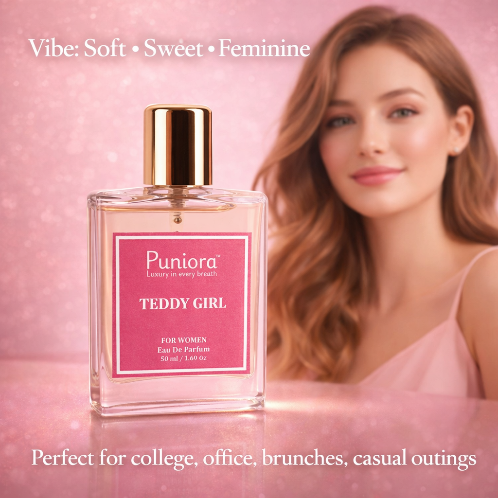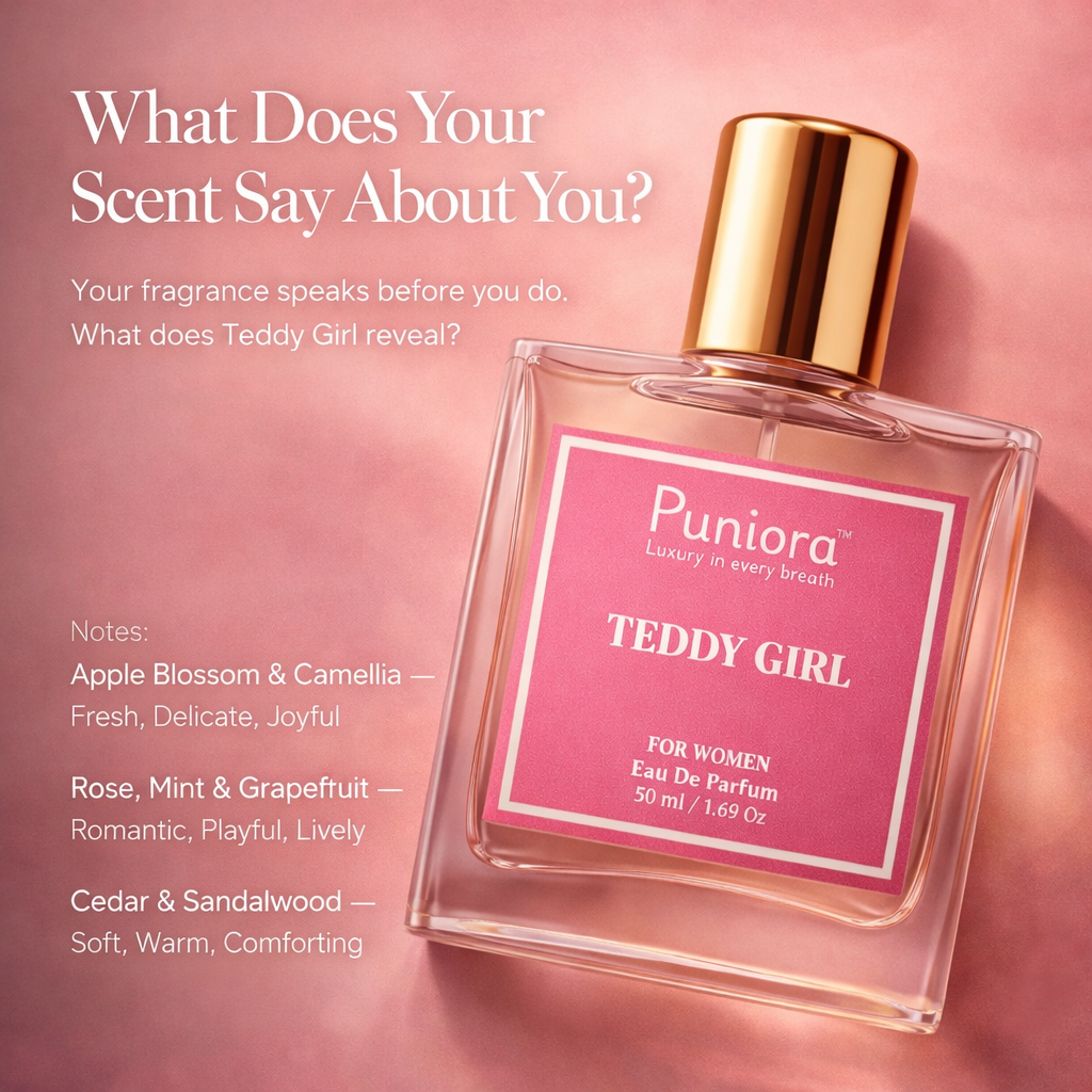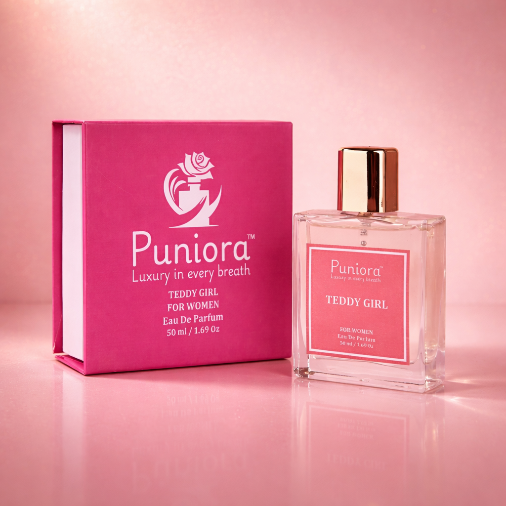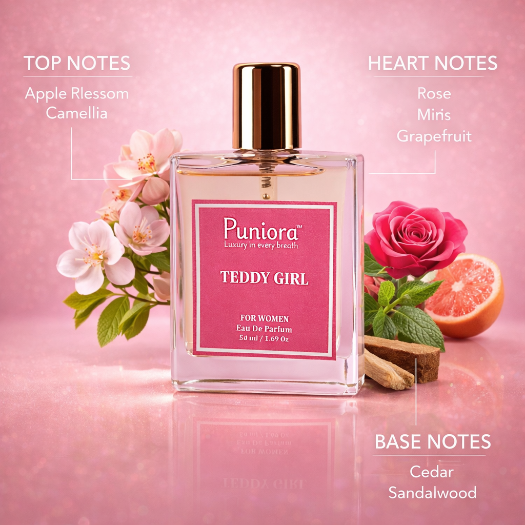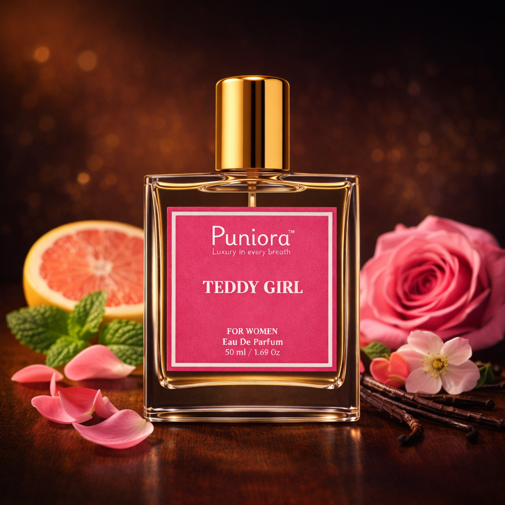 Embrace your feminine charm with Puniora TEDDY GIRL, a soft and romantic perfume for women crafted exclusively for her. This premium perfume for women blends delicate apple blossom and camellia with a heart of rose and mint, grounded in warm cedar and sandalwood for a truly feminine and charming scent.